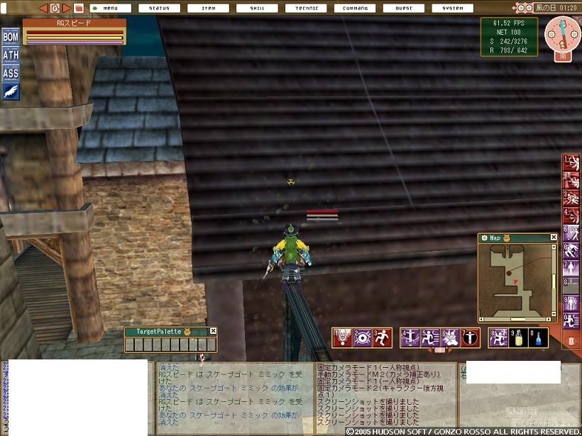 TR+MF+FWで崖(滑る床)に飛んで、そこを伝って屋根の上に乗れます。